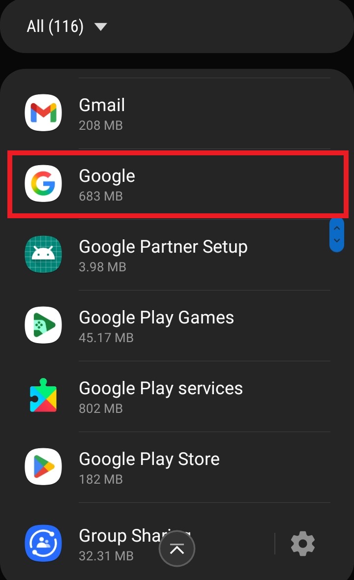 - Find and select the Google App.