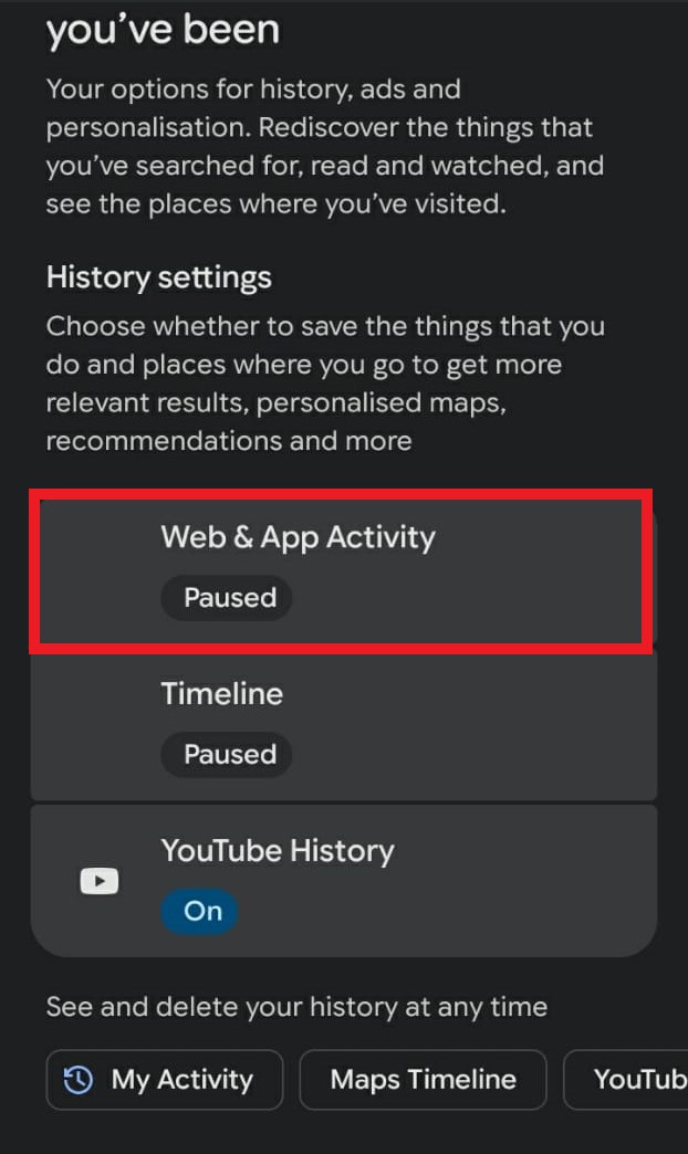 - Under History settings, select “Web & App Activity”.