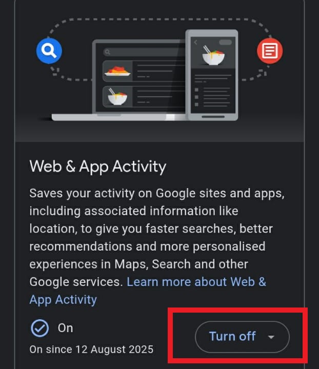 Warning: Disabling Web & App Activity reduces personalization across Google services. You can turn it back on once you confirm whether it resolves the problem.