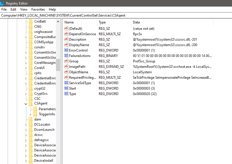 Hit Enter - This will open Registry Editor. Navigate to HKEY_LOCAL_MACHINE\SYSTEM\CurrentControlSet\Services\CSAgent.