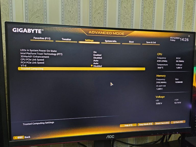 - Next up, we need to enable TPM. Go to the “Settings” tab. In our case, TPM was present under the “Trusted Computing” section. This could be different for your system, so it is best to consult your motherboard’s manual.