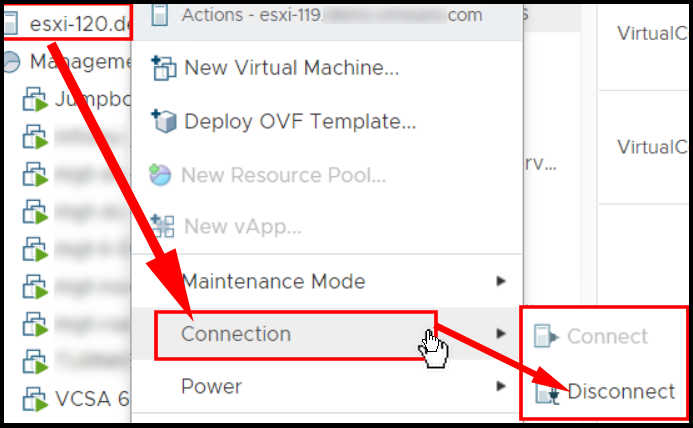 - Once in Maintenance Mode, again right-click on the server. Go to “Connection” and select “Disconnect” as shown. (Credits: VMware)