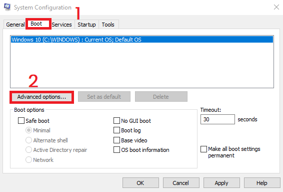 - Click the Boot tab > Advanced options.