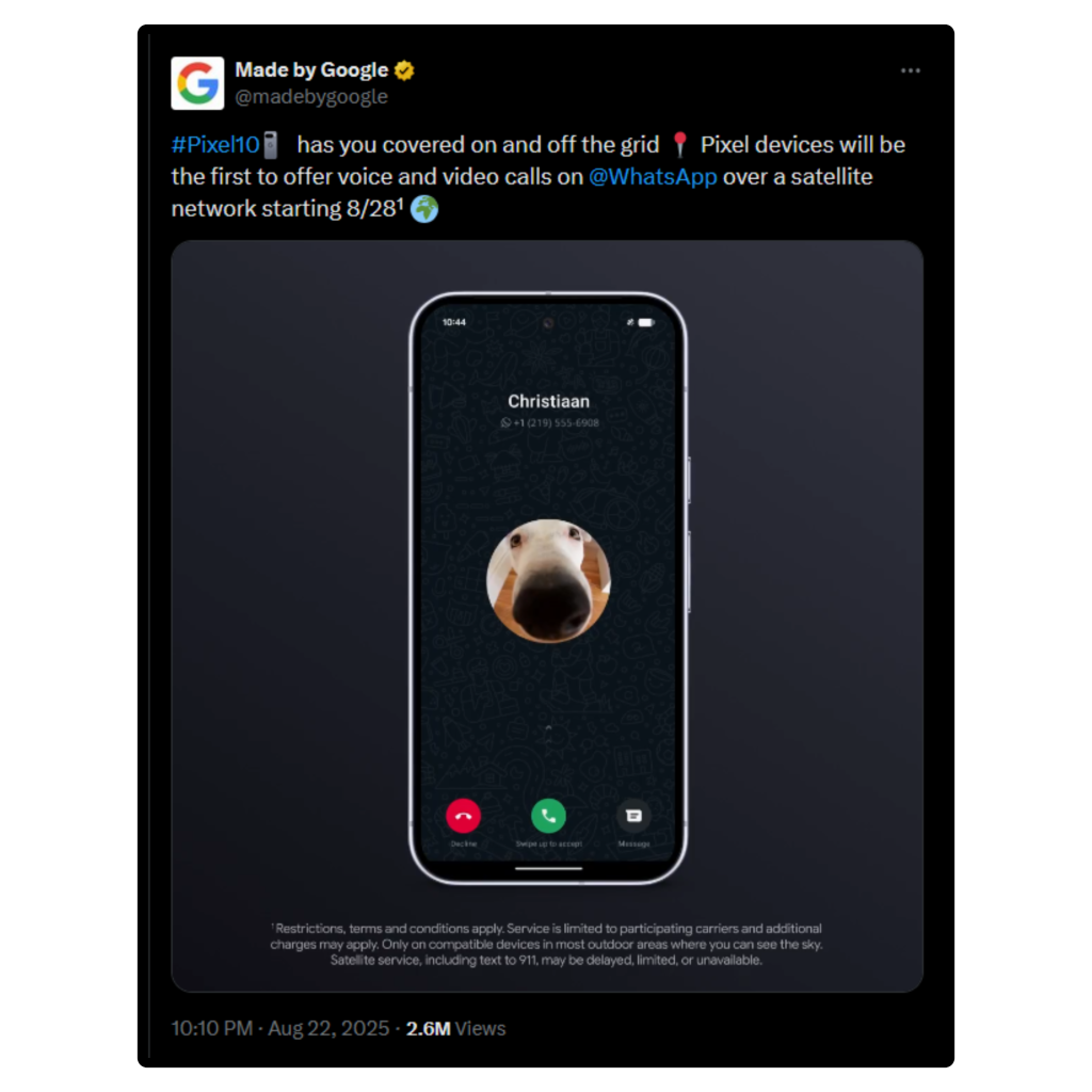 Pixel10 has you covered on and off the grid. Pixel devices will be the first to offer voice and video calls on WhatsApp over a satellite network starting 8/28.