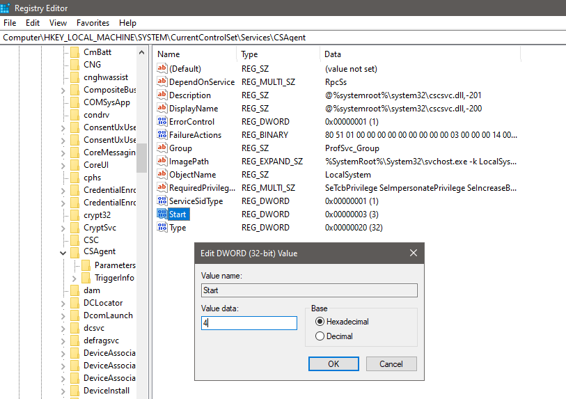 Hit Enter - This will open Registry Editor. Navigate to HKEY_LOCAL_MACHINE\SYSTEM\CurrentControlSet\Services\CSAgent.