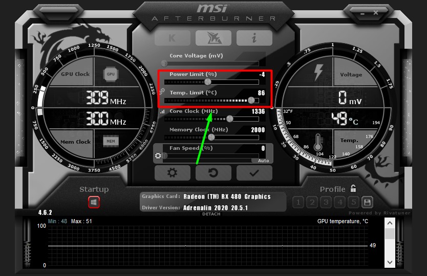 - Restart MSI Afterburner and set the Power Limit (%) to maximum.